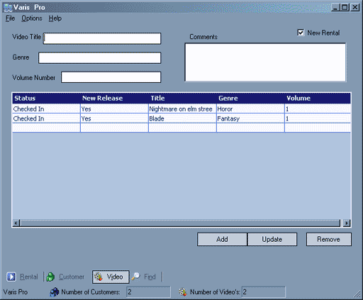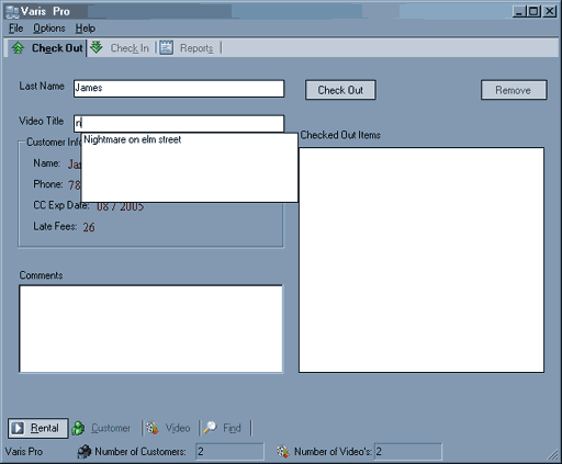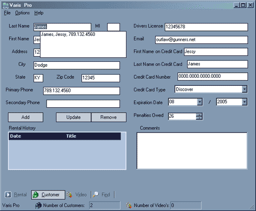 This shot captures the auto-complete feature of Varis Pro in action. although the sample database is very small (in this shot there are only 2 customers and 2 video's so there will be more in the drop down box when you have a full inventory, and you will have the ability to scroll through the list of names and select the one you need..